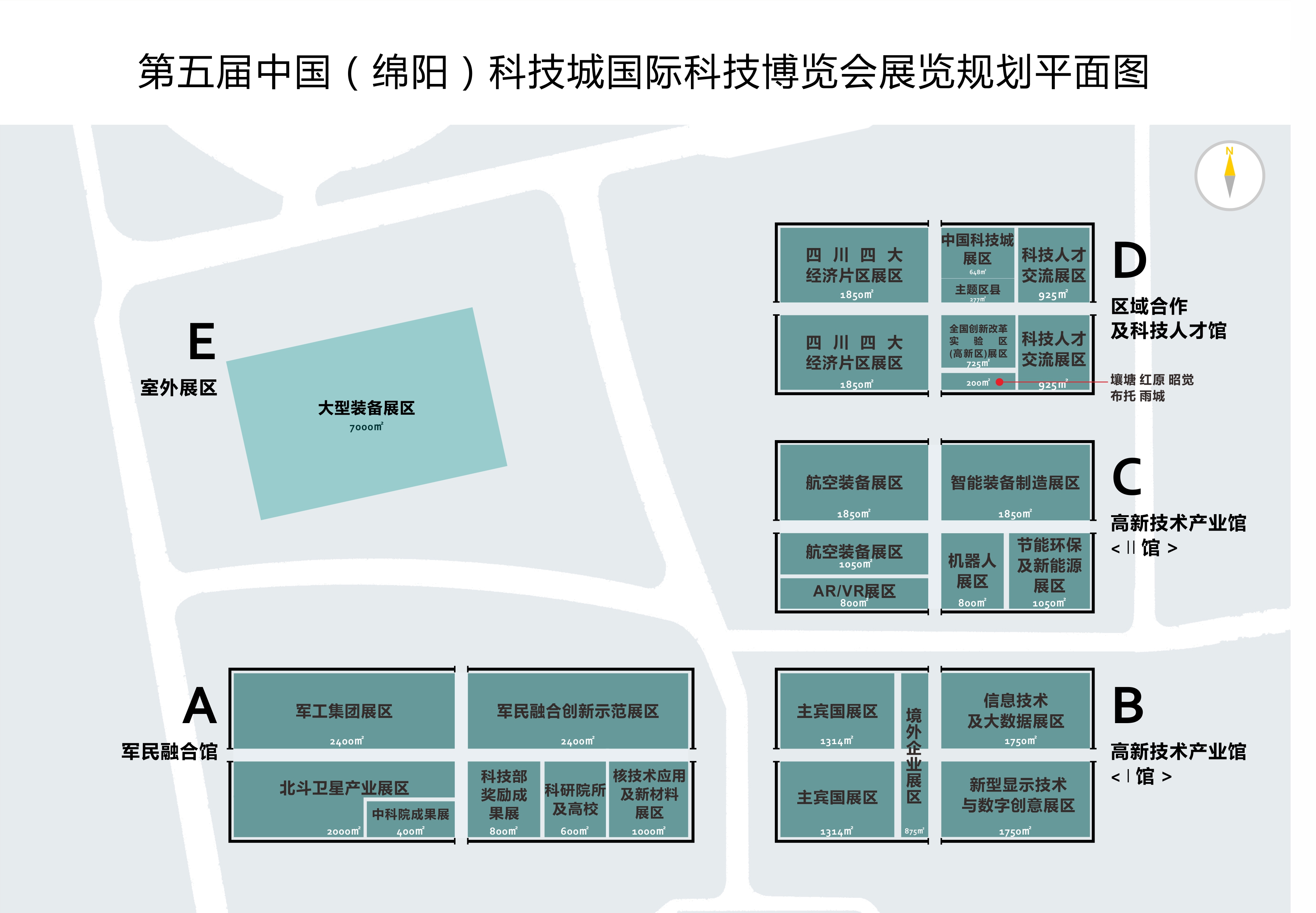 突出军民融合特色,围绕绵阳电子信息、汽车、新材料、节能环保、高端装备制造、生物、食品、化工等重点产业,开展高新技术成果和产品展示。 分室内和室外两大展区,室内设军民融合馆(A馆)、高新技术产业馆(B馆、C馆)、区域合作及科技人才馆(D馆) 室外7000平方米展区主要展示推广大型装备设备、通用航空等领域先进产品和成果。