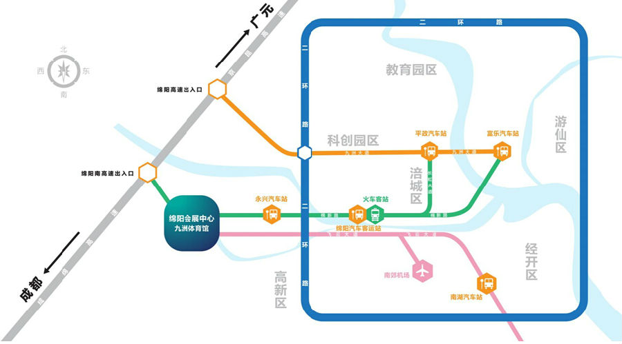 2.步行至南郊机场站,乘坐48路公交,经过28分钟到达南河路中段站,换乘2路或72路,经过51分钟到达九洲体育馆站或狮子山村站并步行至绵阳会展中心。